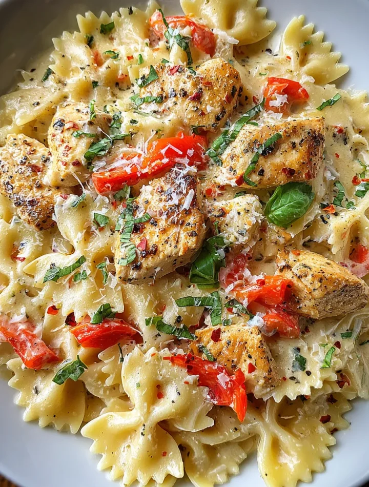 Imagine tender, golden-seared chicken pieces nestled into perfectly cooked bowtie pasta, all coated in a silky garlic cream sauce. Add in the sweet, slightly charred depth of roasted red peppers and the salty richness of melted Parmesan, and youāve got a dish that doesnāt just satisfy hungerāit creates an experience.